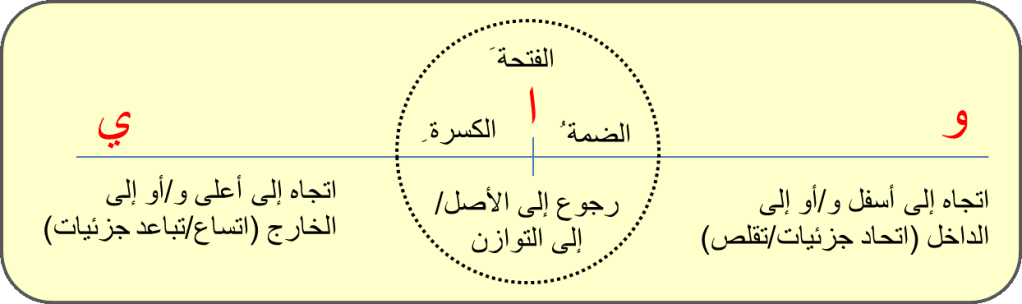 واللطيف أننا نُطلق على أحد وظائف مجموعة الحروف هذه لفظ “حروف المد” أي أننا نمد أي حرف في أحد الاتجاهين بعيدا عن التوازن – بالتقلص في اتجاه الواو أو بالتمدد في اتجاه الياء ، أو نُرجِعه إلى التوازن عند الألِف. فلو كان البُعد عن التوازن بسيطا فقط عبّرنا عنه بعلامات صغيرة فوق الحروف تقابل نفس هذا المفهوم ونسميها “حركات” أو “علامات تشكيل” – الضمة والفتحة والكسرة. من هذا يمكننا أن نفهم ونقدر دقة وجمال لغتنا العربية بشكل أعمق ، لأن التوازن هو أساس كل شيء في الكون ، والبعد عن التوازن لا بد وأن يرتد إلى التوازن حتى تستمر الحياة.