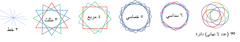 وأن هناك علاقة بين تكرار العدد وتكوين شكل هندسي معيّن. بمعنى أن عدد مرات تكرار الشكل الهندسي الذي نستخدمه مضروب في عدد جوانب/أضلاع الشكل الهندسي سيساوي عدد جوانب الشكل الداخلي المتكون منهم. فمثلا من الشكل عاليه : عدد المثلثات المستخدمة (4مثلثات) إذا ضربناها في عدد أضلاع المثلث (3 أضلاع) تعطينا عدد جوانب الشكل الداخلي المتكوّن منها (12 جانب).