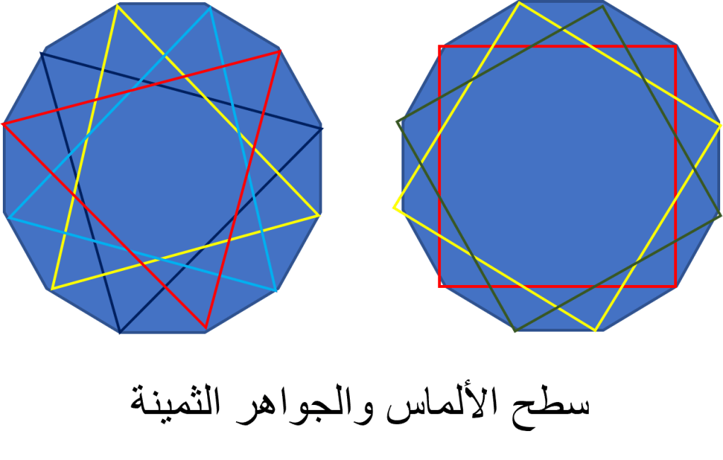 وقد نتعجب حينما ندرك أن الشكلين الأكثر شيوعا في الاستخدام هما اللذان يعتمدان على المثلث والمربع ، والذي ينتج عنهما الشكل الأساسي لسطح الجواهر الثمينة والألماس.